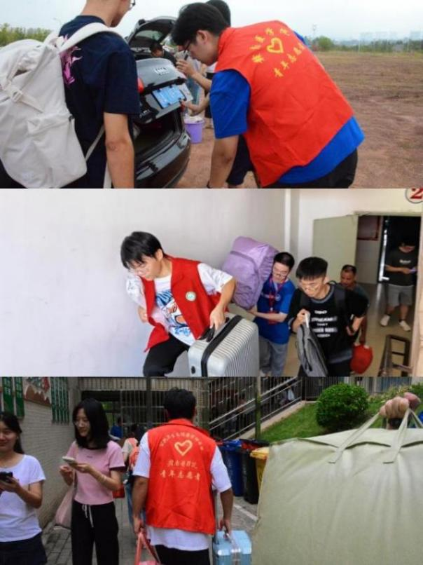 新生班级班主任与学工办全体辅导员在现场迎新。帮助新同学们热闹而有序地完成现场确认入学信息、领取校园卡与校徽等一系列手续。