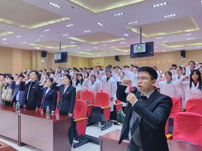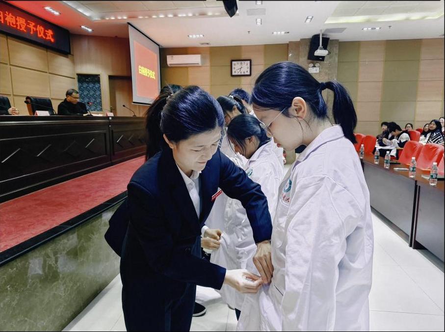 在授袍仪式环节,教师将象征洁白、神圣的白袍授予2024级全体学生,为他们穿上白袍,整理衣领衣扣,送上嘱托。随后,该院副院长刘清泉带领全体医学生重温了《医学生誓言》。
